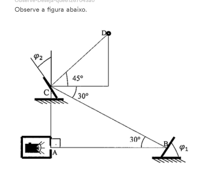 Deseja-se que um feixe de luz proveniente de uma lanterna numa caixa com um orifício pequeno, que está posicionada no ponto A, seja refletido até atingir o ponto D, onde há um detector de luz. Assim, determine os ângulos 𝜑₁ e 𝜑₂ nos espelhos nos pontos B e C de tal modo que a luz chegue ao detector e assinale a opção correta.