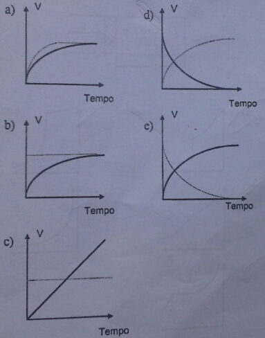 Um balão fechado, previamente evacuado, contém uma ampola cheia de água. Quebrando-Se a ampola, contém uma ampola, nota-se que no equilíbrio ainda sobre a água líquida. O sistema é mantido na temperatura ambiente constante. Assinale a opção que mostra, corretamente, como variam com o tempo (t) as taxas (V) de evaporação (linha tracejada) e de condensação( linha cheia).Estas taxas são expressas em quantidade de substâncias que passa de uma fase para outra, por unidade de tempo e por unidade de área de contato entre as duas fases.