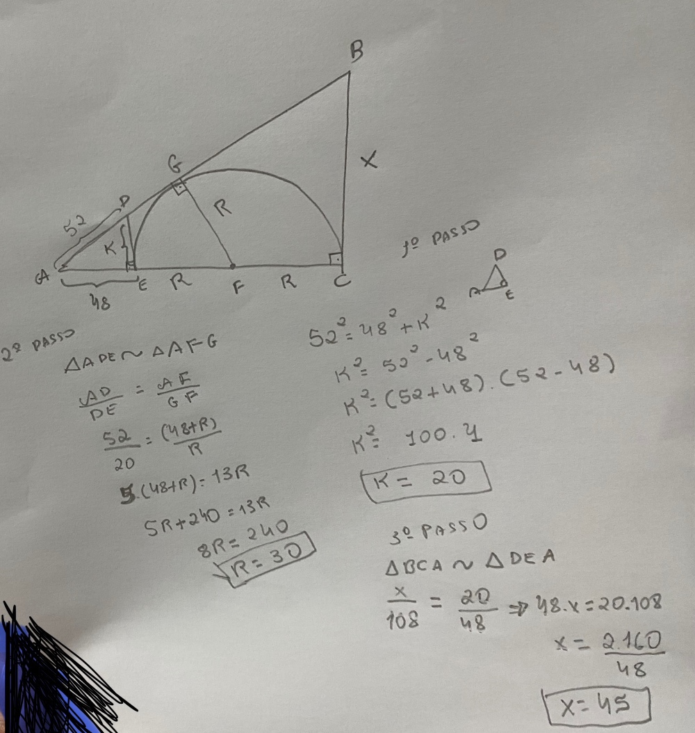 Uma semicircunferência está inscrita num triângulo retângulo, como ilustrado na figura. Sobre um dos pontos de interseção da circunferência com o triângulo é traçado uma reta tangente à circunferência, que produz um triângulo de cateto [tex3]48 cm[/tex3] e hipotenusa [tex3]52 cm[/tex3]. Determine o valor do cateto [tex3]x[/tex3] do triângulo maior.
