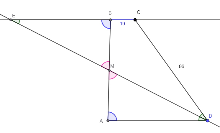 Num trapézio ABCD, os lados não paralelos medem AB = 78, CD = 96 e a base BC mede 19. Sabendo que a bissetriz do ângulo ADC intercepta o lado AB no seu ponto médio, a medida da base AD é igual a: