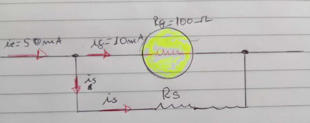 [tex3]\displaystyle \sf \text{R}_{\text{sh}} = \dfrac{i_g \cdot R_g}{\text{i}_{\text{sh}}} \implies \text{R}_{\text{sh}} = \dfrac{10 \cancel{mA} \cdot 100 \ \Omega}{40 \cancel{mA} } [/tex3]