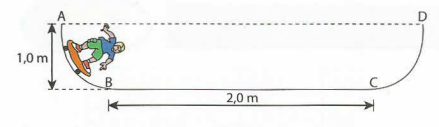 (UFU-MG - mod.) Um menino e seu skate, considerados uma única partícula, deslizam numa pista construída para esse esporte, como representado na figura abaixo. A parte plana e horizontal da pista mede 2,0 m e o menino parte do repouso do ponto A, cuja altura, em relação à base, é de 1,0 m. Considerando-se que há atrito somente na parte plana da pista e que o coeficiente de atrito cinético é 0,20, indique a alternativa correta.