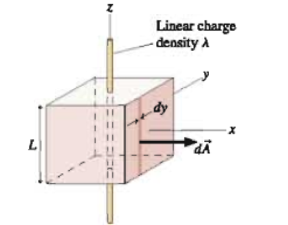 A figura mostra um fio retilíneo uniformemente carregado com densidade linear de carga λ, e uma superfície gaussiana na forma de um cubo de lado L.