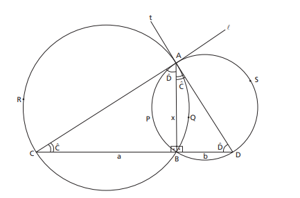 Seja duas circunferência λ1 e λ2 que possuam dois pontos em comuns A e B e duas retas t e l que partem dos pontos C ∈ λ1 e D ∈ λ2. Essas duas retas são tangentes a circunferência respectivamente e interceptam o ponto A (comum a duas circunferência). Assim, formando um triângulo ACD. Determine AB em função de a= BC e b=BD.
